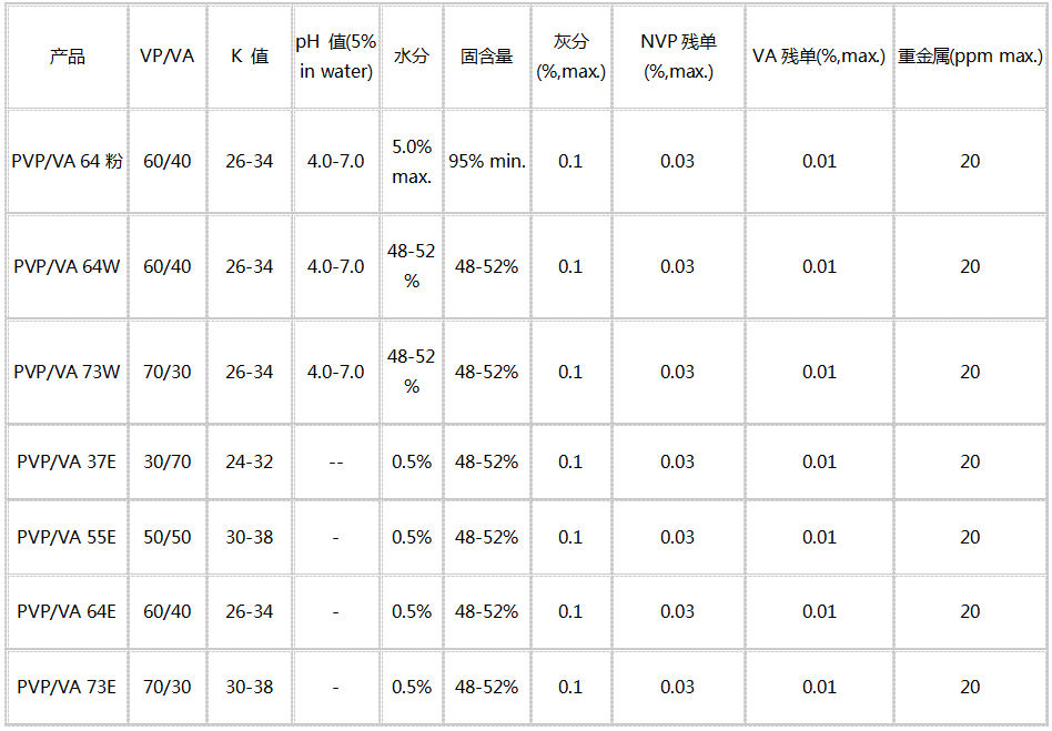 產品特性:VP/VA 產品由不同比例的N-乙烯基吡咯烷酮和醋酸乙烯共聚而成的共聚物,以粉末、液體(包括水溶液和酒精溶液)的形態存在。溶于水、乙醇等多種有機溶劑。具有良好的成模性,且膜堅硬、光澤好、易水洗。